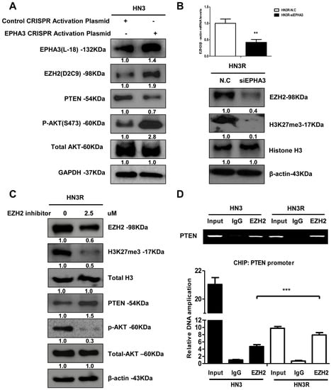 EPHA3 maintains PTEN suppression and Akt activation through EZH2-mediated histone methylation in radioresistant head and neck cancer cells. (A) Protein levels of EZH2, PTEN, pAkt, and total Akt in EPHA3 transfected HN3 cells. (-: control, +; CRISPR Activation Plasmid transfection) (B) Protein levels of EZH2, H3K27me, and total H3 after the silencing of EPHA3 in HN3R cells, and in EPHA3-overexpressing HN3 cells. ** p < 0.01 (C) Expression of PTEN, total H3, pAKT, and total Akt through suppression of H3K27me3 after treatment with the EZH2 inhibitor (2.5 µM). (D) ChIP assays showing endogenous EZH2 bound to the promoter region of PTEN. *** p < 0.001.