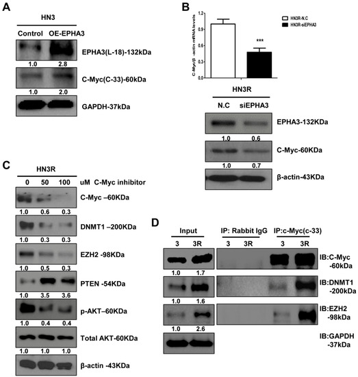 PTEN is repressed by EZH2-mediated histone methylation and DNMT-mediated DNA methylation via the EPHA3/c-Myc pathway in radioresistant head and neck cancer cells. (A) C-Myc protein expression after transfection of EPHA3 in HN3 cells. (B) C-Myc mRNA and protein expression after the silencing of EPHA3 in HN3R cells. (C) Expression of EZH2, DNMT1, PTEN, pAkt, and total Akt after treatment with the c-Myc inhibitor. (D) Assessment of direct interaction between DNMT1/EZH2 and c-myc using immunoprecipitation (IP). *** p < 0.001.