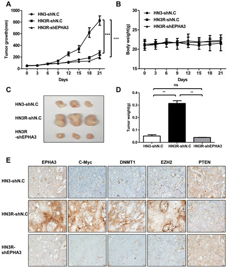 EphA3 inhibition suppress tumor growth through regulation of c-myc, DNMT1/EZH2, and PTEN in an AMC HN3R xenografts model. (A)Tumors were measured regularly, and the relative tumor volume was tracked for each animal (each group: 4 mice). (B) Body weight was measured every three days. (C) The photographs show representative tumors from each mouse of approximate 3 weeks. (D) Tumor weight was examined in each treatment groups at 21 days. (E) Immunohistochemical staining was performed in mouse tumor specimens. Representative photographs are shown. ** p < 0.005; *** p < 0.0001.