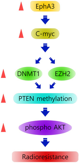 This study proved that C-myc might mediate a functional link between EPHA3 and DNMT1/EZH2, which regulates PTEN/Akt-based radiation resistance. In previous reports, combined MYC activation and PTEN loss induced genomic instability and aggressive prostate cancer [45], and C-myc modulated genes associated with oncogenesis in glioblastoma multiformes cells through deregulation of miRNAs via the c-Myc-miR-26a-PTEN signaling pathway [23]. However, the role of EPHA3 and C-myc, and their relationship with the PETN/Akt pathway in radioresistance, remains unclear. We demonstrated that EphA3 signaling induces the epigenetic silencing of PTEN by DNMT and EZH2, and that c-Myc is required in this process.