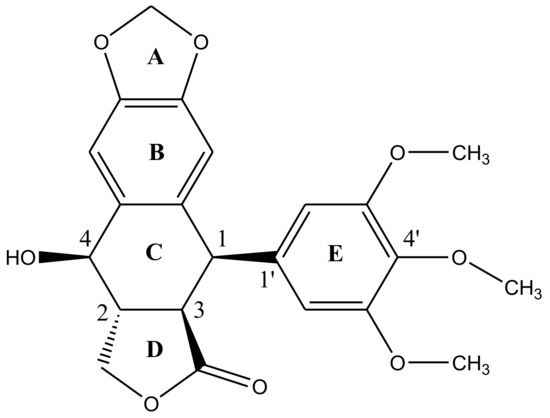 Podophyllotoxin has a five-ring system (ABCDE) having four chiral centers (C1-C4) in a row—Figure 2. There are five important structural characteristics of most podophyllotoxin species: (1) a tetracyclic group going from dioxole ring (A) to the lactone ring (D); (2) four oxygen atoms located at the functional groups lactone, methoxys, secondary alcohol and oxoles; (3) ring E with alpha-configuration located at position 1; (4) four asymmetrical adjacent centers and (5) the unique stereochemical properties of C4 define the molecules’ mechanism of action [31,32]. Studies have revealed, rational modification at C4 can improve the molecule’s topoisomerase II inhibitory activity, drug resistance profile, water solubility and antimitotic activities [33]. The lactone ring is known to exhibit transconfiguration, which easily epimerizes in low basic conditions [32].