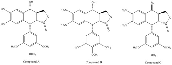 - Google Patents Database. Available online: https://patents.google.com/?q=Podophyllotoxin&num=100&oq=Podophyllotoxin (accessed on 15 February 2021).
