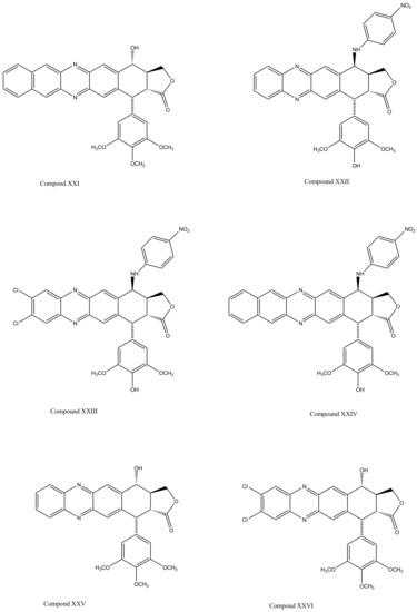 The significance of ring A for biological functionality of podophyllotoxin and its derivatives introduced three crucially significant domains in the parent pharmacophore model. Modifying these domains provided a number of new derivatives as shown (Compound XX1–XXVI). These compounds show distinct mechanism of actions in comparison to the previously discovered podophyllotoxin derivatives.