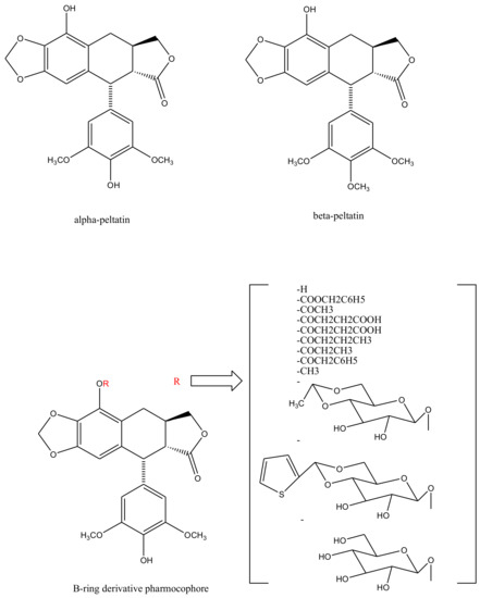 With slight modifications in the podophyllotoxin skeleton, the ring-A-open compounds appeared biologically less active than podophyllotoxin itself [35]; functional studies indicate that an intact A-ring system is important for the compounds’ DNA topoisomerase II (dtopII) inhibiting activity. Based on these findings, three crucially significant domains in the parent pharmacophore model were reported [36]. Modifications at these domains further revealed the unexplored potential of novel clinically applicable derivatives (shown in Figure 4)with a mechanism of action distinct to that of the previously well-established derivative; etiposide [37]. The paucity of studies on B-ring modifications in podophyllotoxin led the investigation of α-peltatin and β-peltatin. These two compounds (Figure 5) exhibited significant antiviral and antitumor activities. In order to investigate the influence of B-ring substitutions and modifications, a series of ester- and ether-derivatives of both structures were prepared by various researchers but were reported to be biologically less active than their parent compounds [38,39,40,41,42,43].
