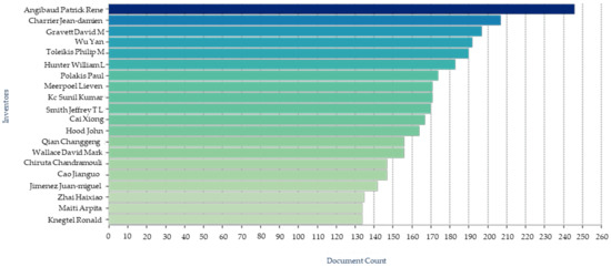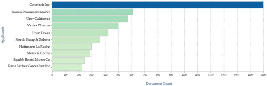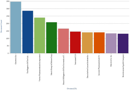 The great interest of institutional researchers and pharmaceutical companies is also validated by a surge in number of patents protecting various inventions involving podophyllotoxin. Searching the term “podophyllotoxin” gave 93,446 results in the Google patent database while 26,582 in the Patent Lens database with the first patent application filed in 1967-12-06 and granted in 1970-08-18. When “podophyllotoxin” is used as keywords for the the patents and/or patent applications annual filed (Figure 9), key applicant companies (Figure 10), key inventors (Figure 11), and key owners based in US (Figure 12) [160,161]