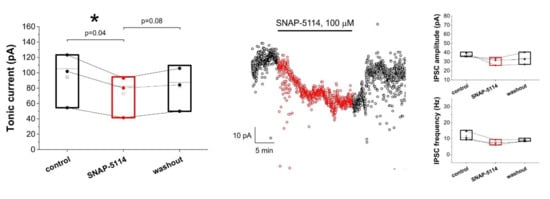 Under control condition, in low-[Mg2+] ACSF we observed that the blockade of GAT-2/3 transporters by 100 μM SNAP-5114 decreased the tonic current from 94.4 ± 20.6 pA to 72.8 ± 16.1 pA (Figure 1). The decrease was found to be significant (p = 0.04, N = 3). The GABAergic origin of the measured current has previously been validated, since SNAP-5114 had no effect on the tonic current in the presence of the GABAA antagonist picrotoxin [26]. The observed decrease in the tonic current is not due to a change in IPSC kinetics, since neither the amplitude, nor the frequency of IPSCs were altered significantly in the presence of SNAP-5114 (Figure 1).