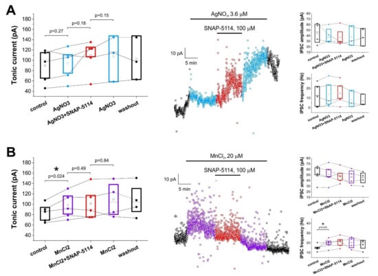 Added AgNO3 or MnCl2 prevents GABA release through glial GABA transporters in low-[Mg2+] ACSF. Effect of GAT-2/3 blockade by 100 µM SNAP-5114 on the holding current of voltage clamp recording segments in low-[Mg2+] ACSF in the presence of of 3.6 µM AgNO3 (A) or 20 μM MnCl2 (B). Left: Box-chart representation of GABAergic baselines during control condition, AgNO3 or MnCl2 application, addition of SNAP-5114 and washout. Box edges represent 25th, 50th and 75th percentile, open squares represent means, circles connected by lines represent paired individual baseline values. (N = 5 for both AgNO3 and MnCl2). Middle: baseline currents plotted at 1 s intervals in a selected experiment. Right: amplitude and frequency of inhibitory postsynaptic currents (IPSCs). Box edges represent 25th, 50th and 75th percentile, open squares represent means, circles connected by lines represent paired individual baseline values. (N = 5 for both AgNO3 and MnCl2). Neither amplitude, nor frequency changed significantly in the presence of AgNO3 (p = 0.31 and p = 0.29, respectively), however MnCl2 significantly increased the frequency of IPSCs (p = 0.035). Black symbols represent control and washout periods, light blue and purple symbols represent AgNO3 or MnCl2 applications, respectively, red symbols represent simultaneous SNAP-5114 and AgNO3 or MnCl2 application in all figures.