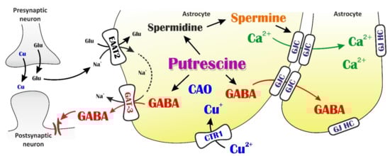 The amount of copper released into the synapse, diffused extra-synaptically and taken up by astroglial copper transporters determines the strength of redox coupling which may vary from physiological to up- or down-regulated. The high extracellular level of copper elicits low surface expression of CTR1 [44], that may be mechanistically linked to Parkinson’s and Alzheimer’s disease mechanisms [97,98] or schizophrenia [99]. Metabolic profiling of brains [100,101,102] and serum [103] of AD subjects suggests a possible role for altered spermidine metabolism correlating AD indicators. Further studies may also substantiate spermidine-associated change of putrescine and GABA that can serve as early serum biomarkers for AD progression in the future.