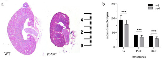 Light microscopy examination of the wild-type and yotari kidneys at 4P. (a) Comparison of wild-type (left) and yotari (right) kidney size. (b) Mean diameters of glomeruli (G), convoluted tubules (PCT) and distal convoluted tubules (DCT) in the kidneys of yotari animals were significantly smaller compared to wild-type animals. Data presented as the mean ± SD (vertical line). Significant differences were indicated by *** p < 0.0001 (two-tailed t-test). Per each sample, 100 PCTs, DCTs, and glomeruli were assessed. Scale bar is 1 mm, refers to images in (a).