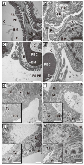 Transmission electron microscope (TEM) microphotographs of wild-type and yotari kidneys. Glomeruli of wild-type animals (a) showed a normally developed filtration barrier with fenestrated endothelium (E) of the capillary (C), basement membrane (BM), podocytes (P) with pedicles (PE), and filtration slits (FS). In the kidneys of yotari animals, effacement of the pedicles and lack of filtration slits could be noticed (asterisks, b–d). No abnormalities were noticed in the proximal convoluted tubules (PCT) or distal convoluted tubules (DCT) of yotari mice compared to the wild-type animals (e–h). In the PCT, the cytoplasm was abundant, containing well-distinguished nuclei (N), elongated mitochondria (M), basal infoldings (BI), and many tubular pits (TP) between microvilli, which formed a brush border (BB) at the apical membrane (e,f). Higher magnification revealed the apical surface of PCT epithelial cells containing long microvilli to form the brush border and tight junctions (TJ) between the luminal cell borders of neighboring tubular epithelial cells (e,f). On the other hand, the apical surface of DCT epithelial cells containing few short microvilli and numerous vesicles (g,h). The scale bar in images (a–d) and insets (e–h) is 1 µm; the scale bar in images (e–h) is 2 µm.