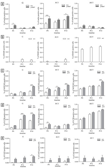 A two-tailed t-test was performed to analyze the differences in the average diameter between PCT, DCT and G of wild-type and yotari animals. The diameter was presented as mean ± standard deviation (SD). The level of significance was set at p < 0.05. A two-way ANOVA test followed by Tukey’s multiple comparison test was used to examine the differences in the percentage of positive cells between PCT, DCT, and glomeruli at all-time points. The percentage of positive cells was expressed as the mean ± standard error of the mean (SEM). The level of significance was set at p < 0.05. The analysis was performed in GraphPad software (GraphPad Software, La Jolla, CA, USA).