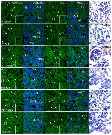 Immunofluorescence staining of postnatal wild-type and yotari kidneys with NOTCH2 and LC3B markers and immunoperoxidase staining with cleaved caspase3 (CASP3) marker. (a–f) Nuclear DNA DAPI staining is merged with NOTCH2 and LC3B. Observed time points were P4, P11, P14. Expression of the NOTCH2 and LC3B markers in the glomeruli (G), proximal convoluted tubules (PCT) and distal convoluted tubules (DCT) is marked with the arrows. Especially strong LC3B reactivity can be observed in the Bowman capsule of decaying glomeruli (asterisk, e). Inserts show the most prominent expression in the image. CASP3 was poorly expressed in all observed time points. The only significant expression was in the glomeruli of yotari mice on P14 (arrows). Scale bar is 20 µm and refers to all images.