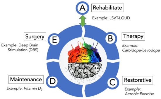 The treatment plan described here incorporates these aforementioned traditional and non-traditional approaches that could help keep PD from progressing. The treatment strategy complements these options with an initial rehabilitation program to carefully assess and address PD before beginning other treatment options and with surgery, in cases where PD has resisted management by the other treatment options. Each of the five steps of this treatment plan for PD offers a comprehensive healthcare strategy and therapy that has been studied or found to be effective in either human or rodent animal studies. Described here is an integrative medicine and health strategy for PD that features five treatment options: rehabilitate, therapy, restorative, maintenance, and surgery (Figure 1).