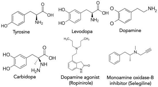 Structures of some of the key molecules involved in dopamine synthesis, drug therapy, and PD.