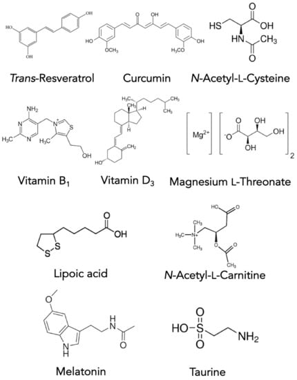 The ultimate goal of CAM therapy is to help maintain the health of remaining dopaminergic cells healthy in PwP. Curcumin is a well-known polyphenol with antioxidant properties [,,]. Curcumin both inhibits NFkB and MAPK and prevents free radical damage. Alpha lipoic acid and acetyl-l-carnitine have been shown to reverse and partially restore mitochondrial function and reduce oxidative vulnerability in experiments using aging mice [,,,]. This suggests that these compounds may offer benefit to the aging population. N-acetyl-cysteine (NAC), one of the building blocks of the important antioxidant glutathione, crosses the blood-brain barrier and reduces oxidative stress. However, NAC also contributes to the reducing potential of the brain, as NAC is thought to be the rate-limiting factor in the production of glutathione [,]. Trans-resveratrol is a potent antioxidant capable of reducing free radicals in the environment of the brain [,]. Finally, melatonin regulates the sleep-wake cycle and also has been shown to protect mitochondria []. Collectively, these compounds may help preserve remaining dopaminergic neurons in the PD brain. Their molecular structures are depicted in Figure 3.