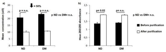 We observed a 50% loss of RNA after the purification step in both non-diabetic and diabetic subjects (Figure 1a) despite the improvement in the 260/280 absorbance in both groups, which reached statistical significance only in the non-diabetic group (Figure 1b). RNA concentrations were comparable between non-diabetic and diabetic patients both before and after purification (before purification p = 0.83; after purification p = 0.88) (Figure 1b). The mean 260/280 absorbance showed no significant difference between non-diabetic and diabetic subjects in both cases (before purification p = 0.7; after purification p = 0.92) (Figure 1b).
