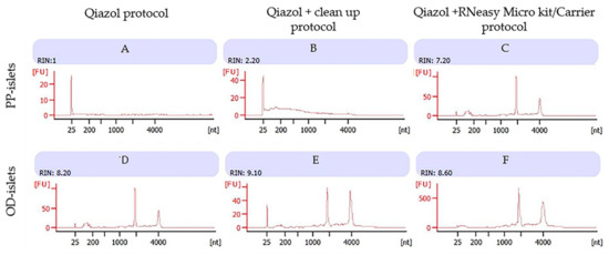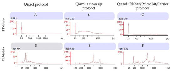 The Microkit/Carrier protocol showed a consistent improvement of the RNA integrity number in RNA from diabetic PP islets (Figure 3C), while no improvement was detected in the RIN in diabetic OD islets (Figure 3F).