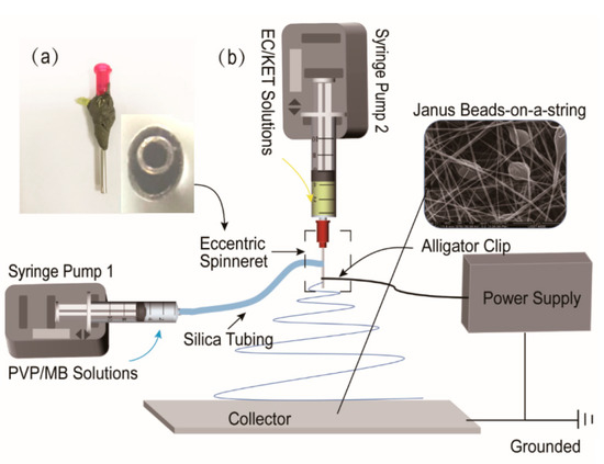The implementation process of side-by-side electrospinning: (a) an image of a home-made eccentric spinneret; (b) schematic drawing of the home-made electrospinning system.