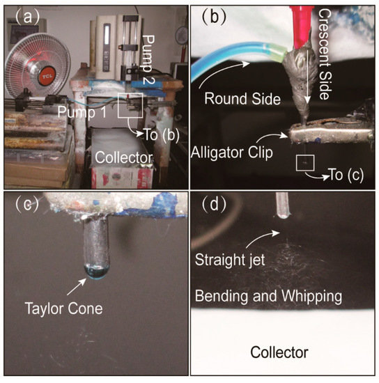 Observations of the side-by-side electrospinning: (a) the home-made side-by-side electrospinning system; (b) the connection of spinneret with two working fluids and power supply; (c) compound Taylor cone (12 kV); (d) typical fluid jet trajectory (12 kV).