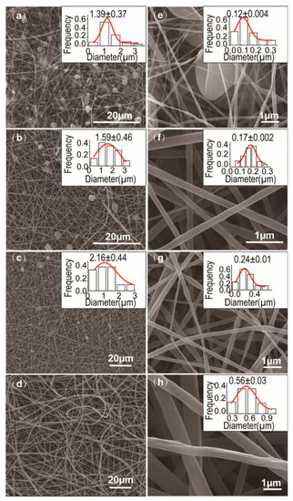 Nanotechnology has been the most widely studied and multidisciplinary technology field for the past few years. Nanotechnology can control the structure of materials at the nanoscale, so as to obtain significant changes in material properties, outstanding advantages and wide applications. Nanomaterials include nanotubes [1], nanosheets [2], nanorods [3], nanoparticles and nanofibers [4], etc., among which nanofibers have their unique properties to get potential applications in a wide variety of fields [5]. The preparation methods of nanofibers include phase separation, template synthesis, melt spray technology, self-assembly, electrospinning and so on [5,6]. Compared with other preparation methods, electrospinning is a “top-down” electrohydrodynamics process (EHDA, including electrospinning electrospraying and e-jetting) [7,8], with simple operation, better continuity and adjustable functionality. Electrospinning nanofibers have a number of advantages, such as large specific surface area, tremendous porosity, low cost and simple process [9,10].