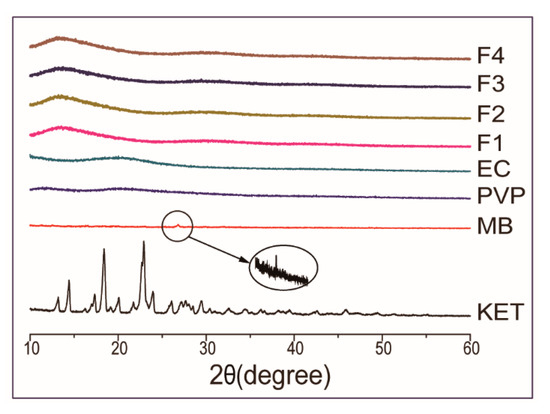 The XRD patterns of raw powders (PVP, EC, KET, MB) and the Janus nanostructures (F1, F2, F3, F4) are shown in Figure 4. The sharp peaks at around 26.8° of MB powders showed their crystalline characteristic. Many sharp reflections of raw KET powders were found in the XRD pattern, proving that the raw drug was a crystalline material. On the contrary, the XRD patterns of PVP/EC had two weak and wide diffraction peaks, indicating that they are an amorphous state. In the XRD patterns of F1, F2, F3 and F4, the distinctive reflections of MB and KET were not discovered. Four Janus nanostructures prepared by side-by-side electrospinning process had similar patterns with the patterns of PVP and EC, which present wide diffraction speaks and there were no sharp peaks (crystalline characteristic). Under the action of the high-voltage electrostatic field, the crystalline drugs (KET and MB) were dispersed in the matrix materials (PVP and EC) in the form of small molecules and existed in the electrospun Janus nanostructures with the amorphous state. The observation indicated that MB and KET as crystalline materials were completely transformed into an amorphous state by the process. The results of XRD confirmed that the Janus beads-on-a-string and Janus nanofibers were amorphous solid dispersions, which could be utilized to figure out the dissolution of the problem with poor water-solubility drugs [35].