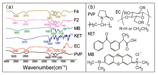 Compatibility investigation: (a) ATR-FTIR spectra of the components (MB, KET, EC, PVP) and their side-by-side electrospun nanostructures F2 (Janus beads-on-a-string), F4 (Janus nanofibers); (b) molecular structures of PVP, EC, KET, MB.