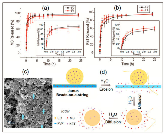 The in vitro drug controlled release profiles of the Janus beads-on-a-string F2 and Janus nanofibers F4 are concluded and compared in Table 2 and Figure 6. Consistent with the concept design, F2 and F4 released near 80% of the loaded MB within 30 min (Figure 6a,b), suggesting an immediate release of MB from the PVP sides in the Janus structures. Many reports demonstrated that PVP nanofibers loaded with the drugs dissolve immediately in several seconds and release the drugs of nanofibers completely [48,56,75,76]. Slightly different from those studies, the other side of Janus nanostructures is hydrophobic polymeric beads of EC. Additionally, the sectional encapsulation of the linear PVP sides in the EC sides should slow down the fast release of MB. After the in vitro dissolution tests, the residues from F2 were observed using SEM, whose images are given in Figure 6c. The beads with lines in them (indicated by arrows) give a hint that (1) the linear sides in the original beads-on-a-string structures were the water soluble polymer PVP and MB; (2) the bead sides were the insoluble EC and the loaded KET; and (3) linear PVP sides were sectionally encapsulated by EC beads before dissolution and created lines on the EC beads in the SEM images.