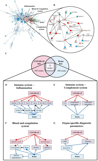 First, a detailed analysis of common pathways was conducted through the superimposition of two knowledge graphs, i.e., the “Heme KG” [42] and the “COVID-19 KG” [54] that encompassed information of heme-driven and COVID-19 pathophysiologies on a molecular basis. In support of the obviously common clinical parameters, several biomarkers emerged that belonged to proinflammatory pathways (cytokines, such as TNFα), the complement system (e.g., C3), the blood and coagulation system (e.g., ferritin, platelets) as well as organ-specific markers (e.g., LDH).