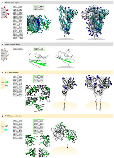 HeMoQuest (http://131.220.139.55/SeqDHBM/) (accessed on 20 April 2020) [55] was used to identify potential HBMs in proteins of SARS-Cov-2 (i.e., S protein, M protein, E protein, and protein 7a) and human host cells (i.e., ACE2 and TMPRSS2). HBM prediction was refined considering surface accessibility, glycosylation sites, and the involvement in disulfide bonds.