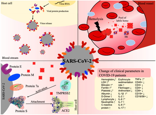 COVID-19 infection and hemolysis show common changes in clinical parameters. Top left: Virus (grey) release after conquering the host cell (yellow) and taking over its protein synthesis machinery. Top right: In the case of hemolysis, erythrocyte lysis occurs in a blood vessel, leading to degradation of hemoglobin (Hb) and, thus, to an excess of labile heme. Bottom left: Interaction between the virus and host cell before cell entry, involving in particular, the viral S protein and protein 7a as well as the human proteins TMPRSS2 and ACE2. Bottom right: Prominent changes in clinical parameters in patients suffering from COVID-19 infection (↑increase, ↓decrease). The terms depicted by an asterisk (*) have been reported in both hemolysis and COVID-19 infection [20,60]. PDBs: 1GZX (hemoglobin), 6VXX (S protein), 6M18 (ACE2), 6W37 (protein 7a).