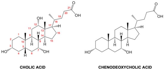 Bile acids (BAs) are hydroxylated steroids synthesized by liver cells via a complex multistep process relying on the cytochrome P450-mediated oxidation of cholesterol [1,2]. BAs are involved in important physiological functions as they facilitate the absorption of various intestinal nutrients (e.g., lipids and vitamins) and promote the biliary secretion of lipids, toxic metabolites, and xenobiotics [1,2]. In humans, the main primary BAs produced by liver cells are cholic acid (CA) and chenodeoxycholic acid (CDCA) (Figure 1) [1,2]. To promote nutrient digestion and absorption in the digestive tract, CA and CDCA are conjugated with either taurine or glycine, generating bile salts that form mixed micelles with phospholipids and cholesterol [1,2,3]. BAs also act as signaling molecules and metabolic regulators through the activation of nuclear receptors, such as farnesoid-X-receptors (FXR), liver-X-receptor (LXR), and G protein-coupled receptors (GPCR), controlling enterohepatic circulation and maintaining the metabolic homeostasis [4].