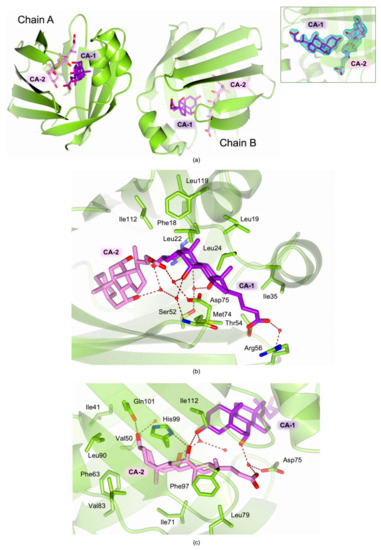 The CA-1 hydroxyls 7 and 12 (atom numbering is displayed in Figure 1) form water-mediated interactions with Asp75 and Met74 and with Arg121 and Ser52, respectively. On the other hand, CA-2 is accommodated in the second site, lined by residues of the strands β2-β9 (Figure 6c). CA-2 is mainly stabilized in this site by van der Waal interactions entailed with Ile41, Val50, Phe63, Ile71, Leu79, Val83, Leu90, Phe97, and Ile112, nonetheless, its hydroxyl moieties 3 and 12 are H-bonded to Gln101 and His99. The latter CA-2 hydroxyl also forms a water-mediated interaction with the CA-1 hydroxyl 3. Furthermore, the carboxylate moiety of CA-2 receives an H-bond from the CA-1 hydroxyl 7 and forms a water-mediated interaction with Asp75.