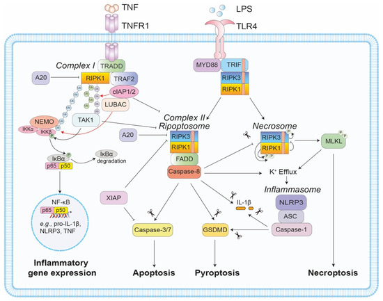 To date, mutations in cell death regulatory genes, including TNFR1, XIAP, A20, OTULIN, LUBAC components (HOIL-1, HOIP and SHARPIN), RIPK1, and caspase-8, cause primary immunodeficiency, autoimmunity, and/or trigger autoinflammation reminiscent of NLRP3 autoactivating mutation-associated cryopyrin-associated periodic syndromes (CAPS). In the case of TNFR-associated periodic syndrome (TRAPs), XIAP deficiency (i.e., hemophagocytic lymphohistiocytosis), haploinsufficiency in A20 (HA20), LUBAC deficiency, otulipenia, and biallelic RIPK1 deficiency common overlapping clinical manifestations include recurrent fever and infection, arthritis and arthralgia/myalgia (i.e., joint and musculoskeletal pain), skin lesions, and intestinal inflammation and/or diarrhoea, as well as on occasion hepatosplenomegaly [63,98,103,104,105,106,107,108]. Often, mutation of these genes in mice causes embryonic or perinatal lethality associated with multi-organ inflammation and/or excessive cell death that precludes analysis of common disease manifestations, but cell-specific gene targeting is beginning to establish disease mechanisms and therapeutic targets [107,109,110,111,112,113]. Moreover, despite the variability in death modalities that may drive autoinflammation, therapeutics targeting TNF, IL-6, or IL-1β itself are comparatively effective, although responses can be unpredictable [114]. Hence, targeting upstream signalling pathways may yield a more uniform therapeutic responsiveness and this approach will be discussed in more detail below.