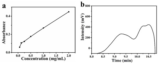 The reducing group could reduce the Fe3+ to Fe2+ in potassium ferricyanide; potassium ferrocyanide and ferric chloride would form Fe4[Fe(CN)6]3 which has the maximum absorption peak at 700 nm. Absorbance at 700 nm is positively correlated with the reducing power of the material. As shown in Figure 1a, the absorbance of the mixed solution at 700 nm increased with the increase of BGP concentration. When the concentration of BGP reached 2 mg/mL, its absorbance reached 0.448. Chen et al. [14] prepare phosphorylated pumpkin polysaccharide and test its antioxidant capacity and reducing capacity. In their study, the absorbance of Fe4[Fe(CN)6]3 is only 0.1 at 700 nm at concentration of 2 mg/mL. Figure 1b showed the curve of BGP retention time. The weight average molecular weight of BGP was 27,957 Da.