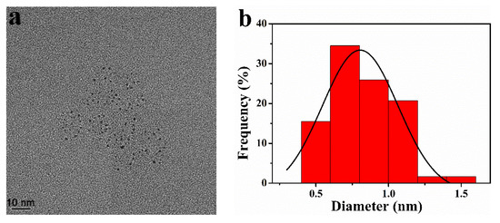 The size of Pt NCs inside Pt-BGP NCs was measured by HRTEM. Figure 2a revealed that the Pt NCs had good dispersibility and were spherical in shape. Statistics showed that the size of Pt-BGP NCs was 0.83 ± 0.22 nm (Figure 2b).