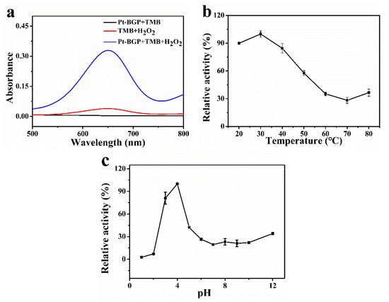 As we know, catalysts have the best catalytic effect when they are under optimal conditions. Therefore, the influence of temperature and pH on Pt-BGP NCs was explored. Figure 4b showed that Pt-BGP NCs had maximum activity at 30 °C. When the temperature was less than 50 °C, all had more than 50% activity. Figure 4c illustrates that Pt-BGP NCs had maximum catalytic activity at pH = 4, while they had very low activity when pH was higher than pH = 6.