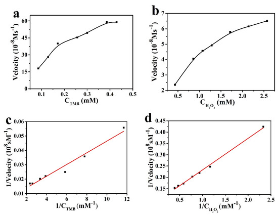 The catalytic kinetics of Pt-BGP NCs for (a) TMB and (b) H2O2; (c,d) was the reciprocal of (a,b).