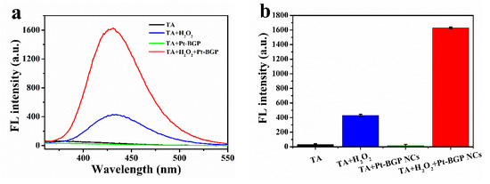 (a) Fluorescence spectra of TA, TA + H2O2, TA + Pt-BGP NCs and TA + H2O2 + Pt-BGP NCs after incubation for 12 h; (b) histograms of fluorescence intensity at 435 nm.