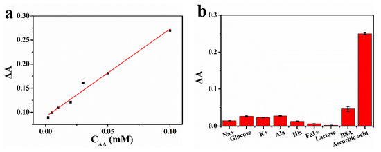 Ascorbic acid undergoes a redox reaction with oxidized TMB to produce colorless TMB. Therefore, the concentration of ascorbic acid was positively correlated with the change of absorbance of oxTMB. Figure 7a showed that the relationship between the absorbance of mixed solution at 652 nm and the concentration of ascorbic acid (2–100 μM) was linear, and this upper limit was a relatively high concentration in the existing literature [24]. The linear regression equation was ΔA = 1.823CAA + 0.0906 (R2 = 0.993), and the detection limit was 0.191 μM. The detection limit of this catalyst was slightly lower than that of other catalysts (Table 2). As shown in Figure 8b, the selectivity of this method was tested with Na+, Fe3+, K+, alanine, histidine, glucose, lactose and BSA.