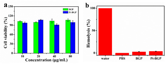 The study of hemolysis analysis of red blood cells was performed to evaluate biocompatibility with red blood cells. Figure 8b shows that the solution turned red when red blood cells were dispersed in water, and the red substance was hemoglobin. When the sample concentration was 100 μg/mL, the hemolysis rates of BGP and Pt-BGP NCs were 2.89% and 3.79%.