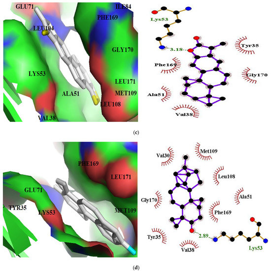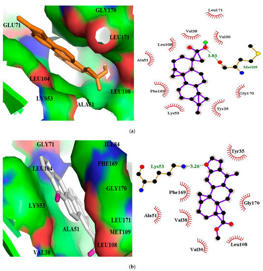 - Laskowski, R.A.; Swindells, M.B. LigPlot+: Multiple ligand-protein interaction diagrams for drug discovery. J. Chem. Inf. Model. 2011, 51, 2778–2786. [Google Scholar] [CrossRef]
