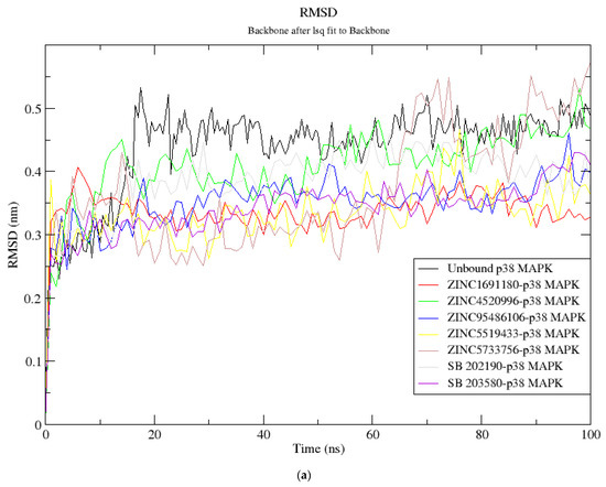 A 100 ns MD simulation was performed on eight structures consisting of the unbound protein, the complexes of the five selected compounds, and the two known p38 MAPK inhibitors SB 203580 and SB 202190. This was aimed at probing the structural stability and conformational changes in physiological conditions [108]. The parameters evaluated were the root mean square deviation (RMSD), the radius of gyration (Rg), and the conformational changes with time.