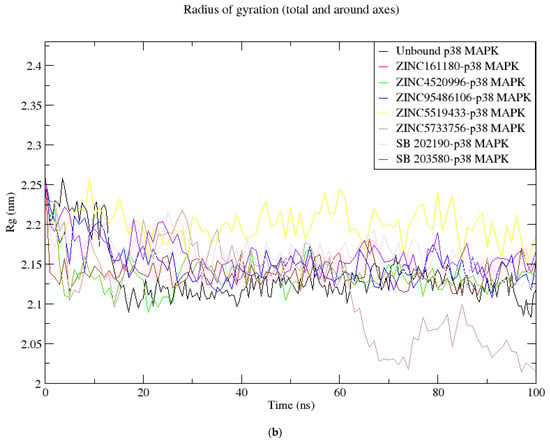Molecular dynamics simulations graphs (a) RMSD versus time (ns) and (b) Rg versus time (ns). In (a,b), the unbound p38 MAPK protein (3ZS5), ZINC1691180, ZINC4520996, ZINC5519433, and ZINC5733756, SB 202190, and SB 203580–p38 MAPK complexes are shown as black, red, green, blue, yellow, brown, ash and purple, respectively.