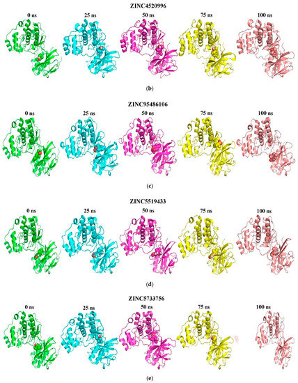 Snapshots at 25 ns intervals ((time step = 0, 25, 50, 75, and 100 ns) for the binding modes of the ligand-p38 MAPK complexes. The cartoon representation shows (a) ZINC1691180, (b) ZINC4520996, (c) ZINC95486106, (d) ZINC5519433 and (e) ZINC5733756- p38 MAPK complexes. The ligands are represented as spheres and the protein as cartoons. All the ligands were observed to bind stably in the ATP binding pocket.
