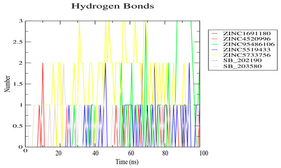 The total number of hydrogen bonds formed between the selected compounds and the protein structure. ZINC1691180, ZINC4520996, ZINC95486106, ZINC5519433, ZINC5733756, SB 202190, and SB 203580-p38 MAPK complexes are represented as black, red, green, blue, yellow, brown and ash, respectively.