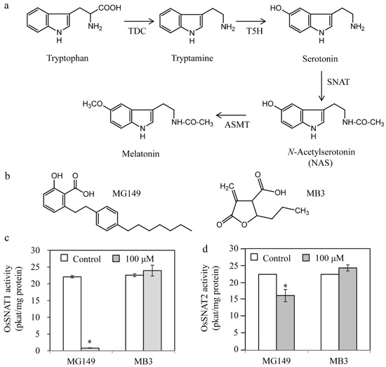 Inhibition of rice serotonin N-acetyltransferase by two histone acetyltransferase inhibitors. (a) Melatonin biosynthetic pathway with the corresponding enzymes. (b) Structures of the two histone acetyltransferase inhibitors. Inhibitory effects of MG149 and MB3 on rice recombinant (c) OsSNAT1 and (d) OsSNAT2. The control contained 0.1% ethanol. Bars show mean activity of three assays ± SE. Asterisks (*) indicate significant differences from the control (Tukey’s HSD; p < 0.05). TDC, tryptophan decarboxylase; T5H, tryptamine 5-hydroxylase; SNAT, serotonin N-acetyltransferase; ASMT, N-acetylserotonin O-methyltransferase.