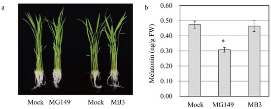Quantification of melatonin in rice seedlings in response to MG149 and MB3. (a) Photograph of rice seedlings treated with inhibitors for 24 h. (b) Melatonin content in 7-day-old rice seedlings rhizosperically treated with 100 μM inhibitor for 24 h and subjected to HPLC analysis for melatonin quantification. The mock contained 0.1% ethanol. Asterisk (*) indicates significant difference from the mock control (Tukey’s HSD; p < 0.05).
