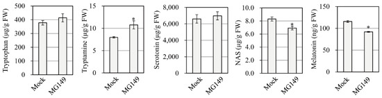 Quantification of melatonin and its precursors in rice seedlings. The 7-day-old rice seedlings were rhizosperically treated with 100 μM MG149 plus 0.5 mM cadmium for melatonin induction for 3 days. The mock contained 0.1% ethanol. Asterisks (*) indicate significant differences from the mock control (Tukey’s HSD; p < 0.05).
