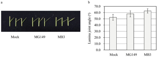 Measuring the lamina joint angle in response to MG149 and MB3. (a) Photograph of the lamina joint angle. (b) Bending angle of lamina joint. Seven-day-old rice seedlings grown in soil were dissected at the second leaf lamina joint and floated on mock solution containing either MG149 or MB3 for 3 days in the dark. The mock contained 0.1% ethanol.