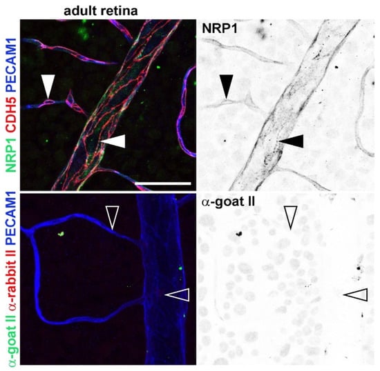 - Fantin, A.; Schwarz, Q.; Davidson, K.; Normando, E.M.; Denti, L.; Ruhrberg, C. The cytoplasmic domain of neuropilin 1 is dispensable for angiogenesis, but promotes the spatial separation of retinal arteries and veins. Development (Cambridge) 2011, 138, 4185–4191. [Google Scholar] [CrossRef]